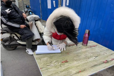 照片中正在為居民進(jìn)行登記的志愿者是滄州開發(fā)區(qū)站職工裴云。9日被封控在市區(qū)后,一想到奮戰(zhàn)在一線的醫(yī)護(hù)人員和被困在各個(gè)崗位的人們有家難回,她心中十分焦灼惦念,強(qiáng)烈的責(zé)任感驅(qū)使她第一時(shí)間報(bào)名了新華區(qū)小樹林社區(qū)的志愿服務(wù)崗位。盡管被凍得瑟瑟發(fā)抖,但是寒風(fēng)中的她仍然盡職盡責(zé)、一絲不茍,為進(jìn)出路口的每一個(gè)人員進(jìn)行體溫測(cè)量和登記。