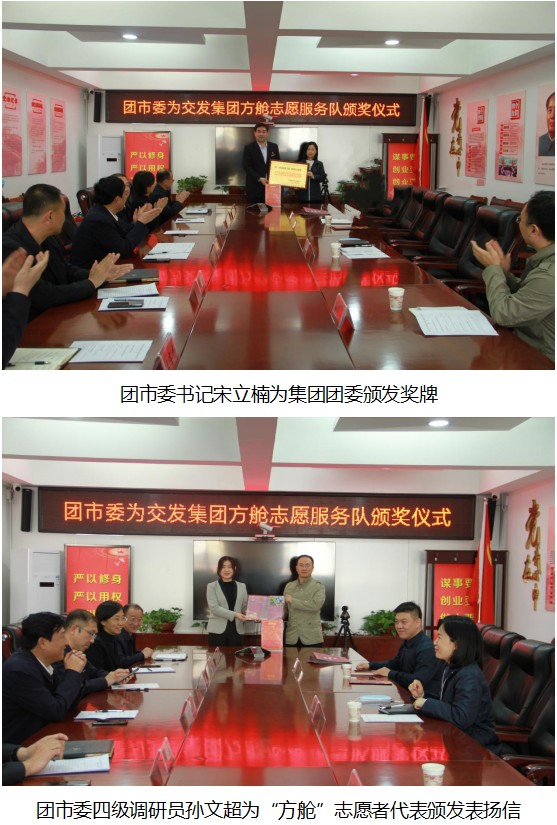 交發(fā)集團(tuán)黨委委員、副總經(jīng)理李文靜主持會(huì)議,交發(fā)集團(tuán)黨委副書記王澎簡要匯報(bào)了交發(fā)集團(tuán)志愿服務(wù)活動(dòng)開展情況;團(tuán)市委孫文超調(diào)研員宣讀了感謝信;團(tuán)市委宋立楠書記為交發(fā)集團(tuán)頒發(fā)了獎(jiǎng)牌,并對交發(fā)集團(tuán)高度的社會(huì)責(zé)任感和廣大干部職工勇于擔(dān)當(dāng)、敢于奉獻(xiàn)的精神給予肯定和贊揚(yáng)。交發(fā)集團(tuán)黨委書記、董事長劉俊德、黨委副書記、副總經(jīng)理?xiàng)钫钜约凹瘓F(tuán)相關(guān)部室領(lǐng)導(dǎo)和志愿者代表參加會(huì)議。