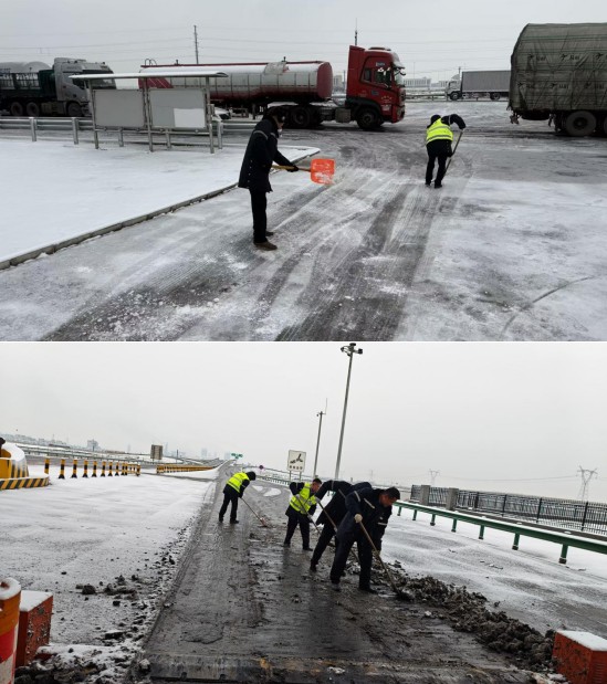 此次行動(dòng)嚴(yán)格遵循“先保通、后保暢”和“除雪為主、融雪為輔”原則,人員、物資、機(jī)械設(shè)備提前部署就緒。引導(dǎo)車(chē)、大型專(zhuān)業(yè)鏟雪作業(yè)車(chē)、融雪劑撒布車(chē)、預(yù)警車(chē)組成作業(yè)梯隊(duì),有序開(kāi)展聯(lián)合作業(yè),重點(diǎn)對(duì)橋面、互通匝道、彎道等易滑路段加大融雪物資撒布量,并駐人盯防強(qiáng)化處置效果。各收費(fèi)站率先開(kāi)展人工除雪,全面清理車(chē)道、廣場(chǎng)及站區(qū)積雪,同時(shí)安排人員前置指揮疏導(dǎo)限行車(chē)輛、引導(dǎo)車(chē)流有序通行,提升通行效率;道路養(yǎng)護(hù)中心隨后對(duì)收費(fèi)站內(nèi)外廣場(chǎng)、匝道口等關(guān)鍵區(qū)域開(kāi)展深度鏟冰除雪,徹底消除安全隱患。