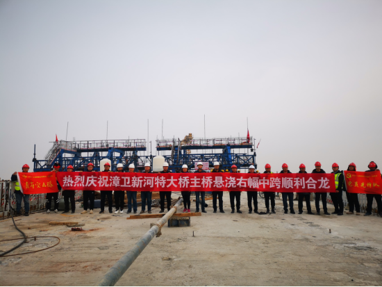 2021年12月10日15時(shí),G0111秦濱高速公路冀魯接線段工程漳衛(wèi)新河特大橋主橋完成懸澆,順利合攏。滄海納百川,在碧水藍(lán)天的映照下,隨著最后一方混凝土泵送完成,漳衛(wèi)新河特大橋雄壯的身姿已經(jīng)完整地體現(xiàn)了出來,這預(yù)示著距離大橋正式通車又邁出了堅(jiān)實(shí)的一步。