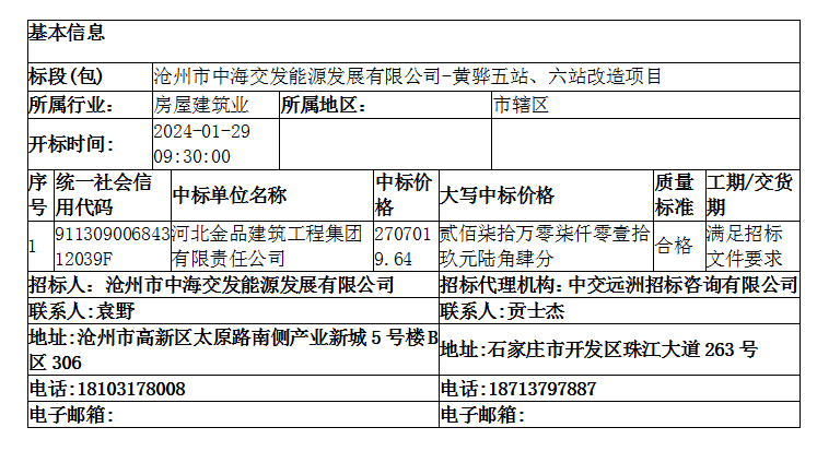 滄州市中海交發(fā)能源發(fā)展有限公司-黃驊五站、六站改造項目中標(biāo)公告
