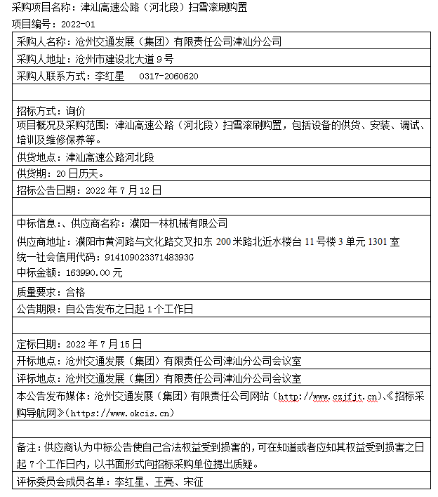 津汕高速公路(河北段)掃雪滾刷購置中標(biāo)公告