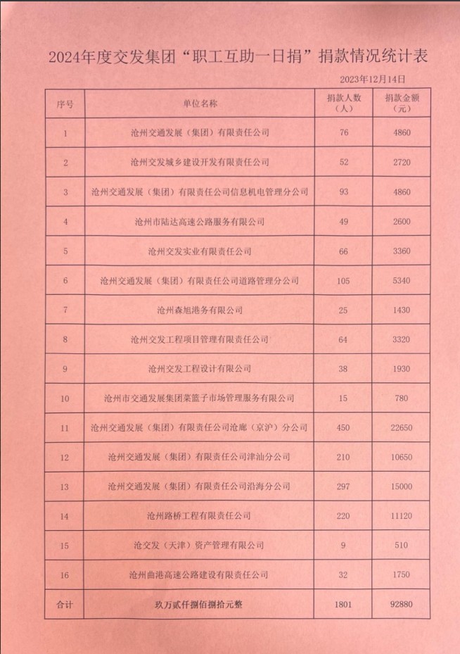 開展“職工互助一日捐”活動(dòng),是全市各級(jí)工會(huì)組織深入貫徹落實(shí)習(xí)近平新時(shí)代中國特色社會(huì)主義思想和中國工會(huì)十八大精神,積極協(xié)助黨和政府解決民生問題,維護(hù)職工穩(wěn)定的一項(xiàng)具體舉措。滄州交通發(fā)展(集團(tuán))有限責(zé)任公司根據(jù)滄州市總工會(huì)辦公室《關(guān)于開展 2024 年度“職工互助一日捐”活動(dòng)的通知》,于2023年12月,組織開展了2024年度“職工互助一日捐”活動(dòng)。